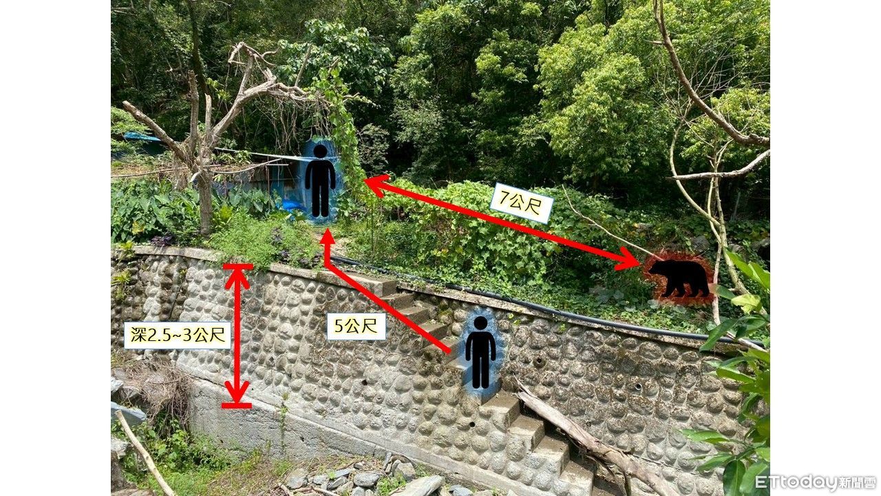 ▲▼巡護隊員遭遇黑熊的現場與人熊相對位置示意圖。(圖/花蓮分署提供,下同)
