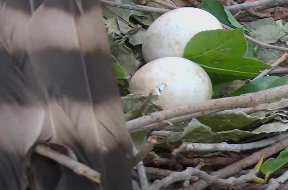 台灣猛禽研究會分享,3月鳳頭蒼鷹「小花夫婦」開始築巢,3月底便觀察到這對夫婦生了2顆蛋,推估5月初寶寶將會破殼而出。5月5日下午,鏡頭拉近觀察時發現其中一顆蛋破洞了,代表裡頭的小鷹正在努力破殼,很快就有機會看到小寶貝的身影,不過新生命的出生並不容易,還需要耐心等待小鷹將蛋殼完全啄開,才能見到廬山真面目。