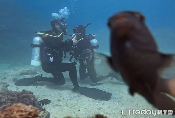 ▲潛水教練在拍攝教學影片,結果遇到雀鯛搶鏡頭。(圖/半島海人提供,請勿隨意翻拍,以免侵權。)