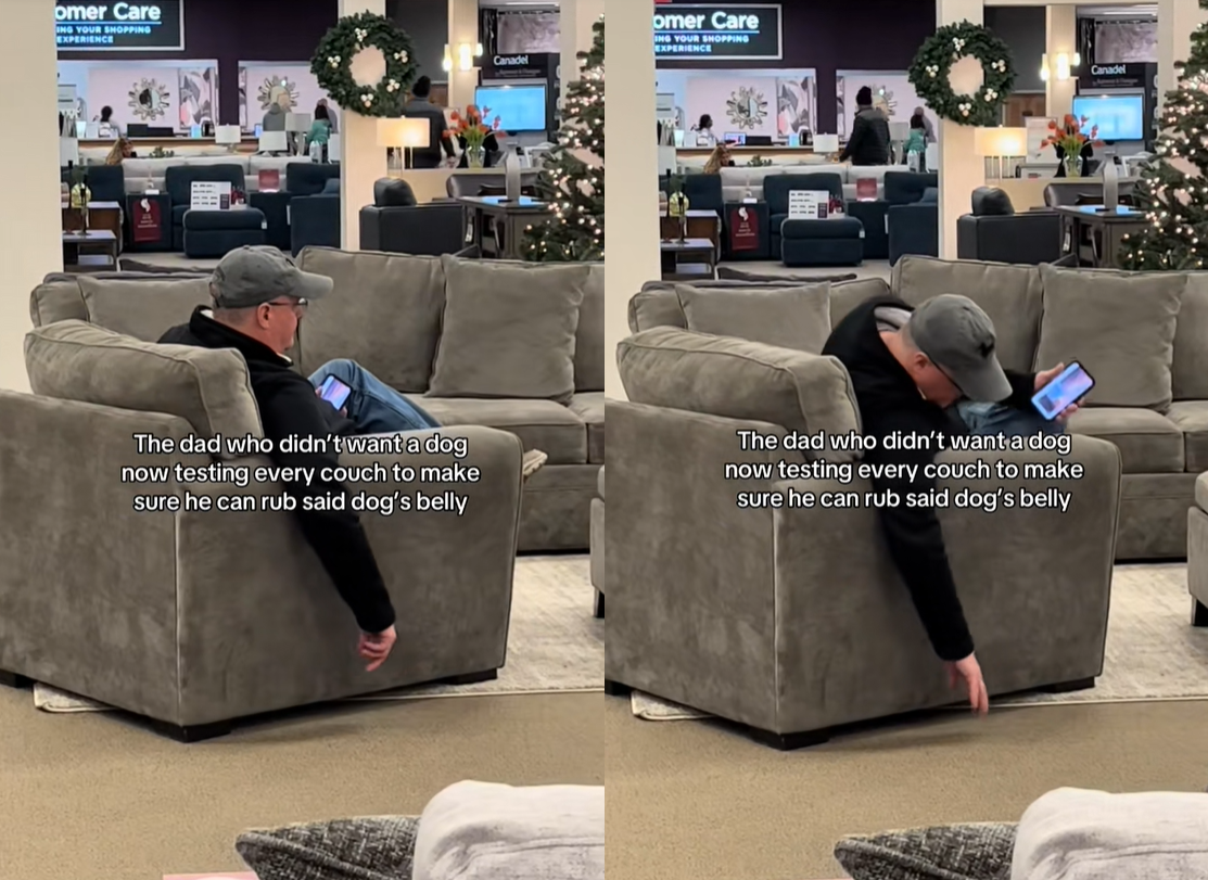 Sam在Tiktok@astraightgeeksesh分享,他的叔叔去家具行挑新沙發,當他坐在一座深灰色的單人沙發上,突然敲敲沙發側邊,手在沙發邊擺弄,彷彿在撫摸沙發邊的隱形的物體,奇怪的舉動其實是有原因的,「叔叔一心只想擼狗」。