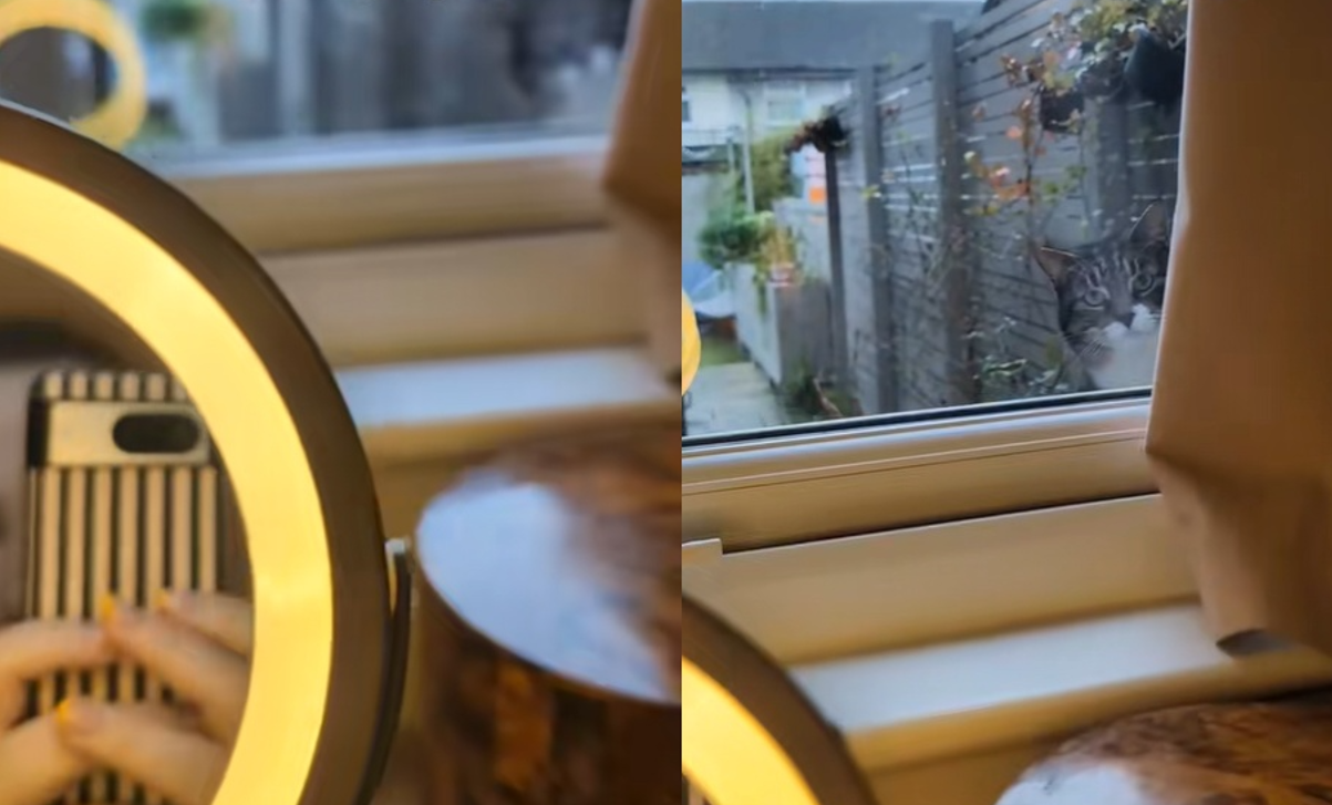 女網友@pepperthenaughtytabby在TikTok上分享影片,影片中可看到,當她坐在梳妝台前化妝時,突然感覺到一個視線緊盯著她,她往窗外看去,竟然看到一隻虎斑貓出現在窗前,和她大眼瞪小眼。