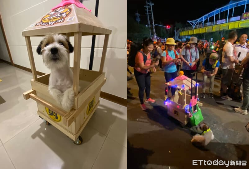 白沙媽遶境的隊伍中,一台會發光的小轎子吸引許多人的目光,坐在上面的是傑克羅素犬「橘子」,牠平常是台中豐原區農會的推廣大使,這次第一次跟爸爸媽媽一起體驗遶境求平安,各種裝備超齊全!