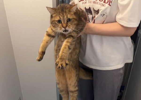 Minira被奴才從腋下抱住,被拉成長長的「一條貓」,雙手有些無助地懸在空中,表情混合著絕望與驚訝,似乎不敢相信原本說好的點心時間居然變成最討厭的洗澡。平時的牠對於自己的零食有很強的保護慾,之前飼主假裝把貓咪的零食餵給家裡的水獺布偶,結果娃娃慘遭喵皇一掌拍飛。
