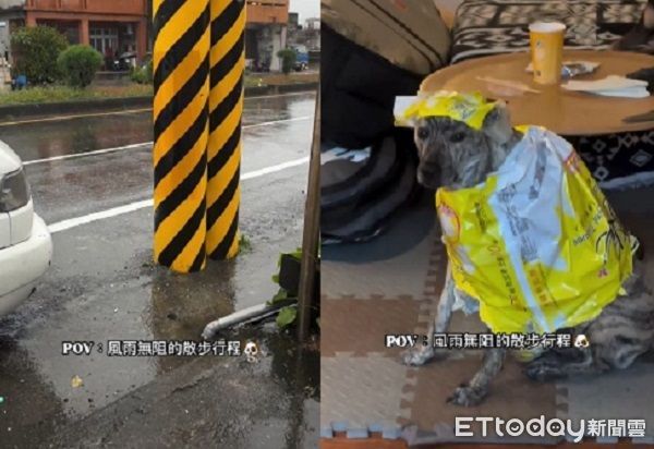 透過影片可以看到,貢丸身上穿著用來衛生紙外包裝的塑膠袋,前腳部位則有剪開兩個洞方便行走,頭上還搭配著同牌子的擋雨帽。凱文與《ETtoday寵物雲》分享,替愛犬做雨衣完全是臨時起意,「因為外面下大雨,牠剛洗好澡」。雖然貢丸百分百配合爸爸,「非常聽話,說穿就穿」,但表情開始懷疑狗生,「我是誰?我在哪?」。