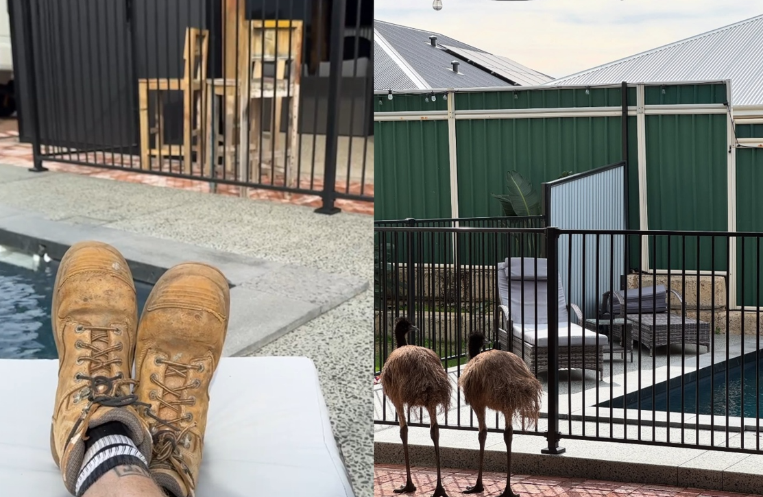 男子卡倫(Callum Layton)6日在臉書上分享,下午他獨自在道斯維爾(Dawesville)家中處理家務時,突然2隻巨大動物闖進院子中,仔細一看竟然是澳洲鴕鳥鴯鶓(Emu)。