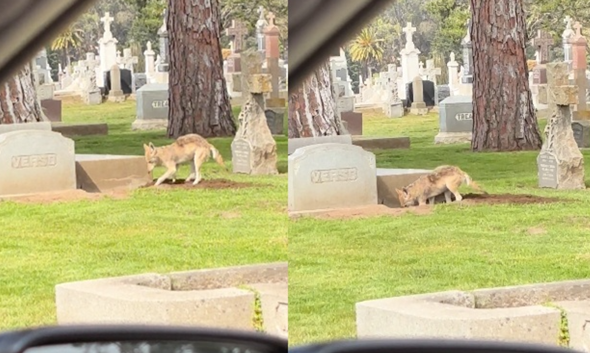 女子海利(Erin Haley)在網路上分享,她帶著孩子到舊金山郊區戴利城(Daly City)公墓地Holy Cross Catholic Cemetery祭祀母親時,意外拍到一隻郊狼正在挖墳的畫面。