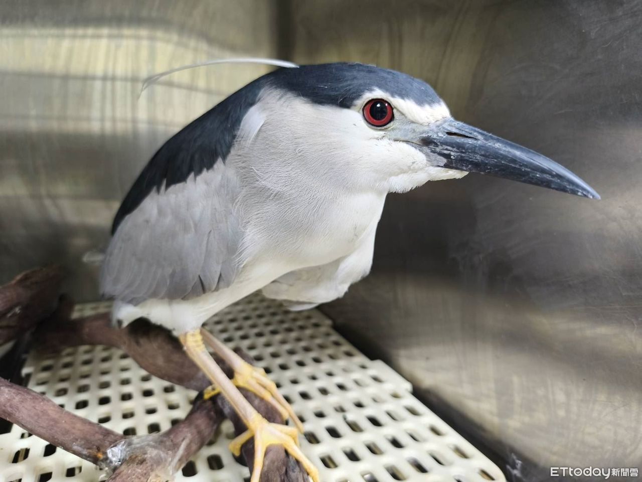 新北市動保處表示,安康路某鐵工廠阮姓作業員通報,庭院魚池旁出現一隻「企鵝」,擔心魚池中的名貴錦鯉被吃,他便先捕捉並用紅色塑膠繩暫時綑綁,隨後通報動保員協助。動保員程沛宏一到場就發現,「看外觀就知道是夜鷺,不是企鵝啦!」,真相讓大家噗哧一笑。
