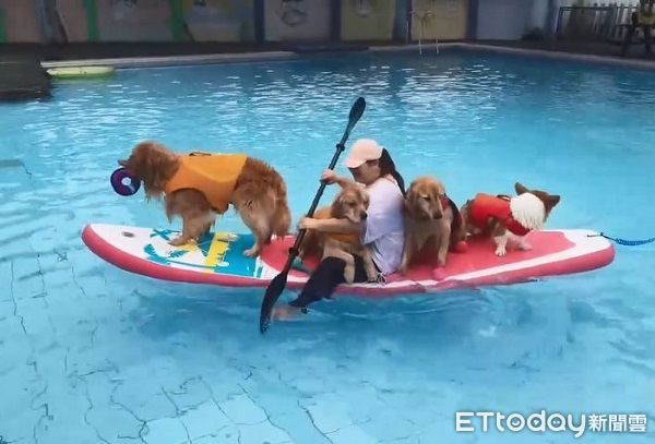 六寶媽與《ETtoday寵物雲》分享,除了搭船外,狗狗們也有玩水上版的你丟我撿,「會丟玩具給牠們撿回來,還有跳水」,4隻毛孩也都「超喜歡游泳的唷」,雖然媽媽不小心失敗一次,但牠們還是對搭船玩水充滿興趣,「大家爭相要搶著上船,一起撿玩具」,連浮板都快被毛孩們的體重壓成U字形。