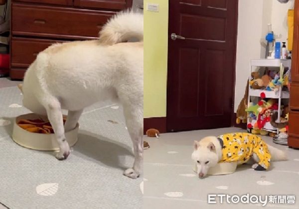 白柴爆Q從小被家裡的貓咪「饅頭」帶大,因此有時候會做出一些「貓里貓氣」的事情。之前飼主何婉如買了藏食玩具給愛犬玩,結果饅頭直接把整個碗當床躺,沒想到爆Q也有樣學樣,把兩隻手跟上半身硬擠進去,完全就是一隻「貓咪柴」!