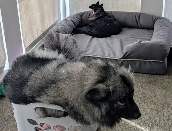 住在加州的貝果(bagels)是隻一歲的荷蘭毛獅犬,在疫情期間被帶回家的牠超黏爸爸丹尼爾。儘管飼主特地替這隻15公斤的毛孩準備了足夠大的狗床,但貝果寧願把自己擠近塞滿衣服的洗衣籃,因為裡面滿滿都是爸爸的味道。