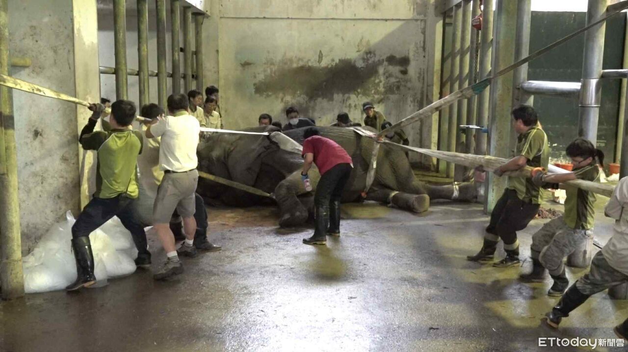 ▲園方動員人力,經歷4小時仍無法協助3噸多種的美代再次起身。(圖/台北市立動物園提供)