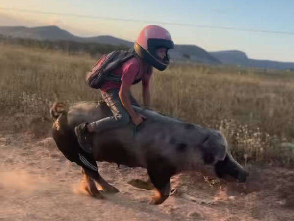 野豬騎士來囉!巴西一名9歲的國小男童「Gutinho Rocha」,每天都會騎著豬豬坐騎「火箭」去上學。只見火箭腳踩泥土地高速的奔馳在田野中,只花了大約1分鐘就成功將小主人送達。奇特的畫面甚至超過7000萬次的觀看數量,意外爆紅讓Gutinho Rocha成為學校的風雲人物。