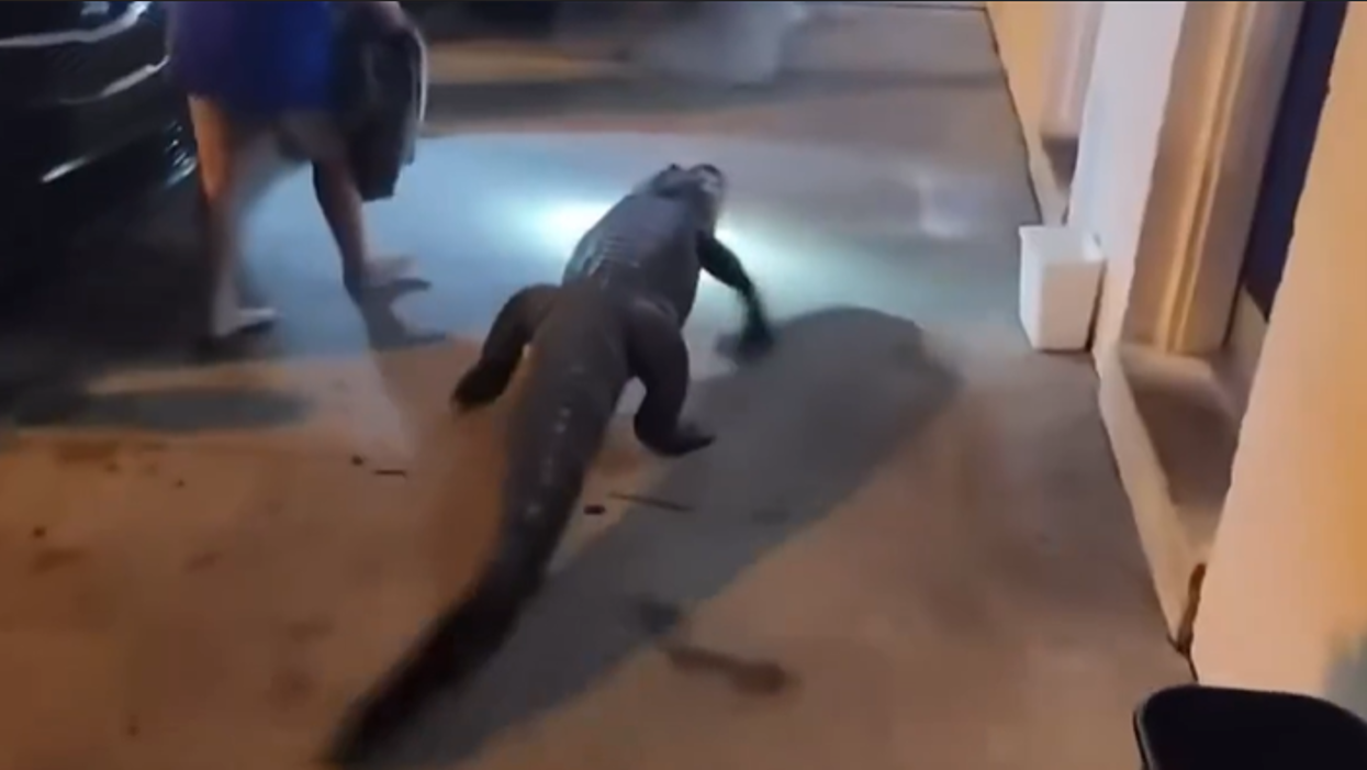 從警方隨身側錄器畫面中可看到,當員警抵達現場時,也被巨大鱷魚嚇了一跳,可聽到一名員警驚呼,「天啊,那是一隻鱷魚,旅館外面真的有鱷魚」,員警小心翼翼靠近鱷魚,並且推估鱷魚應該有6英尺長。