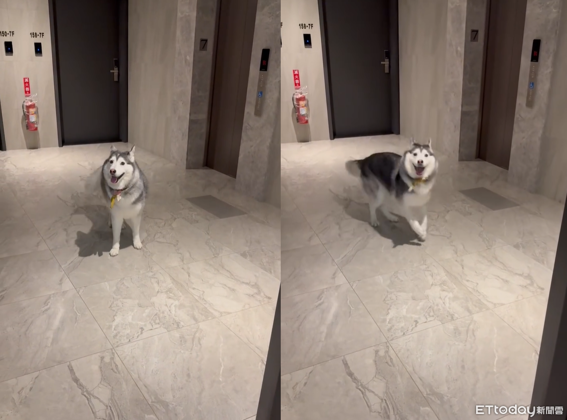 哈士奇「牟妮」在走廊機動跳舞,吵著要出門玩,而門外就能聽見「咻咻咻」颱風肆虐的聲音,無論媽媽怎麼要牠「進來!」,牟妮還是一臉笑嘻嘻,像是在說「走啊出去玩啊!」。