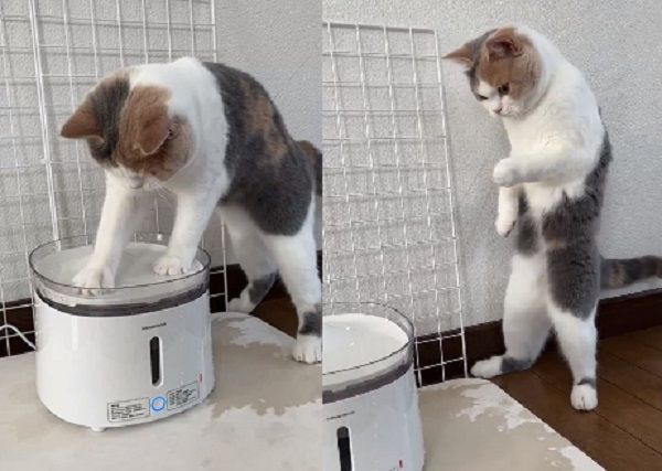 不少貓奴都會在家中裝設自動飲水機,確保主子能在炎熱的夏日中隨時補充水分。日本有隻叫做露娜(るなちゃん )的英短三花貓,第一次看見這種機器時顯得非常好奇,先是一臉狐疑的狂撥裡面的水,發現它居然會自己流出來時還嚇到站起來。