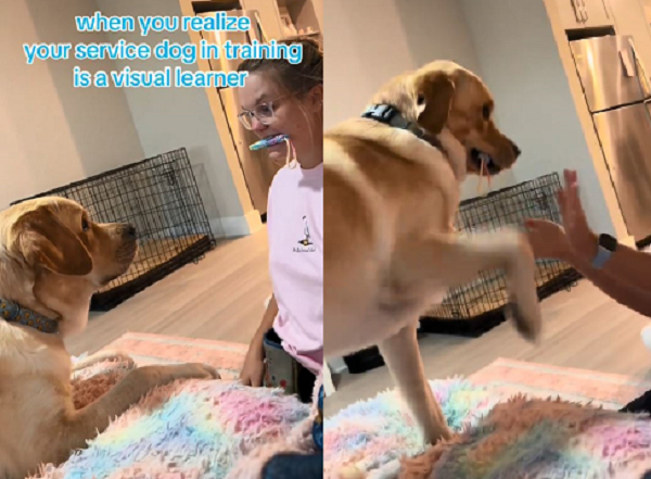住在國外的拉布拉多達基(Duckie)是隻服務犬實習生,總是聽不懂飼主麥迪森的指令。這天她決定嘗試自己親身示範,先讓達基看見自己叼住玩具,再讓牠學著模仿。結果這招成功起效,讓初次成功的一人一狗都超級開心。