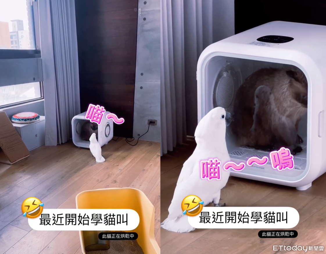 影片中,當一隻貓咪在浴室烘毛時,宙斯在外面自由走動,不斷發出「喵喵」的聲音,像是挑釁貓咪,這一幕引發了不少笑聲。宙斯的模仿能力非常強,甚至讓人難以分辨到底是真貓叫,還是鸚鵡模仿貓叫。