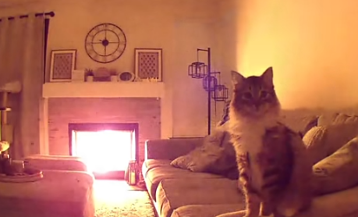 影片中可看到,聰明的Marble發現家中失火,居然懂得利用寵物監視器通知主人,牠淡定坐在攝影機前,背後火爐發出熊熊火光,感覺火勢即將要失控,畫面看起來十分驚險。