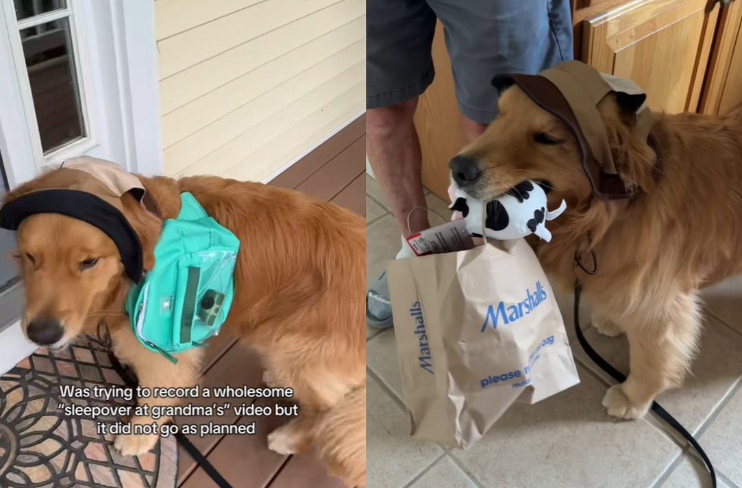 美國一隻可愛黃金獵犬深受全家人喜愛,近來主人因為需要出遠門,把牠暫時送到爸媽家幫忙照顧,還特別準備了一個可愛過夜包,想要給爸媽一個驚喜,沒想到狗狗見到爺爺奶奶太興奮,差點把身上物品全都甩到地上,溫馨畫面在網路上爆紅。