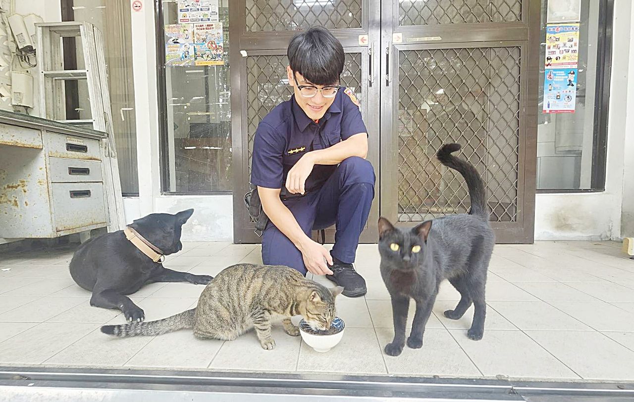 昨天上午,員警黃佳樂在派出所前發現一條臭青母與「小胖」在糾纏,隨後被制服在地,員警們直說,所幸「小胖」機警與敏捷身手,避免蛇類爬進所內,成功守護同仁與洽公民眾安全,同仁則笑稱:「小胖才是真正的毛小孩警員」。