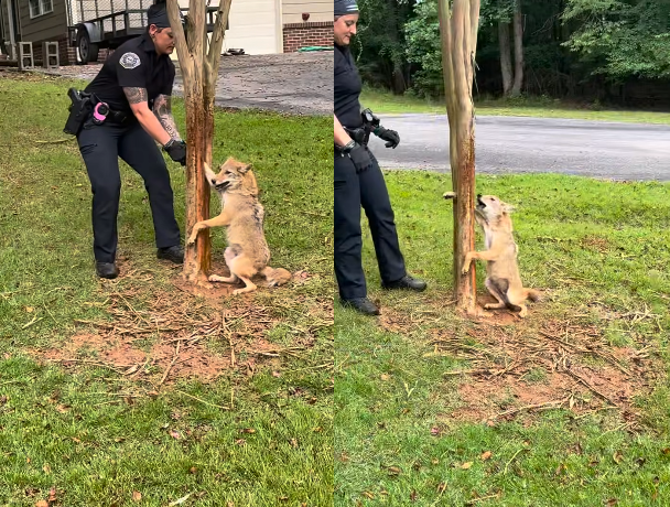 美國阿拉巴馬州近日發生一場驚險的動物救援事件,一隻郊狼的前腳不幸卡在樹幹裡,無法動彈。附近的屋主發現後立即報警求助,隨著警察到場,這隻郊狼因為腳被夾住,顯得非常驚慌,不斷對著周圍的人狂叫,情況相當緊急。