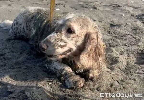 ▲地瓜球來到海灘玩水,結果變成一條芝麻麻糬。(圖/Threads@@_guagua_12提供,請勿隨意翻拍,以免侵權。)