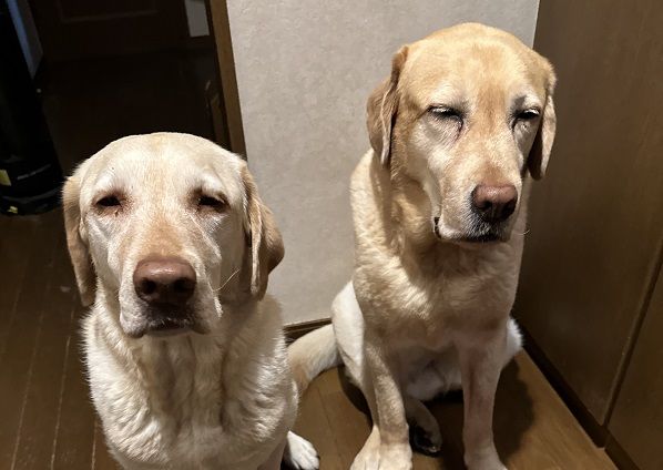 麥爾茲與米娜站在門口,看起來睏到迷迷糊糊,但在聽見主人準備外出的聲音,身體還是遵循著記憶來到門口目送千秋出門,臉上似乎寫著「我好累喔」。事實上當時是凌晨3點半,確實不是飼主平常的出門時間,兩隻狗撐到看見大門關上,就立刻跑回去睡回籠覺,飼主也在留言中表示,「在我鎖門時,聽到了上樓的腳步聲」。