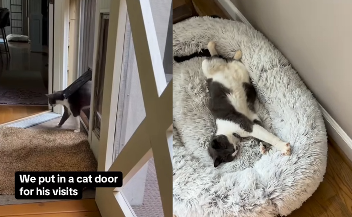 國外一名女子家中養了2隻寵物犬,8歲鬥牛犬艾米(Emmie)和11歲拉布拉多甘尼(Gunny),雖然家中沒有養貓,鄰居貓奧利佛(Oliver)卻常跑到她家作客,由於貓咪幾乎每天都來,最後直接幫奧利佛裝了專屬貓門,方便這隻貓朋友進出。