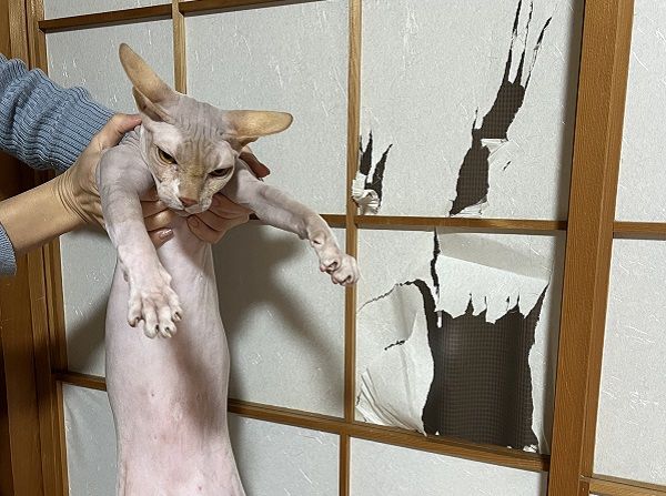 對鏟屎官而言,目睹主子搞破壞是非常稀鬆平常的事情。四歲的無毛貓托羅(トロ)雖然平時是隻乖巧的小貓咪,但某天就破壞了飼主家的紙製拉門,不但留下了非常清晰的爪印,就連被奴才抱起來示眾時也是仍擺出一張臭臉。