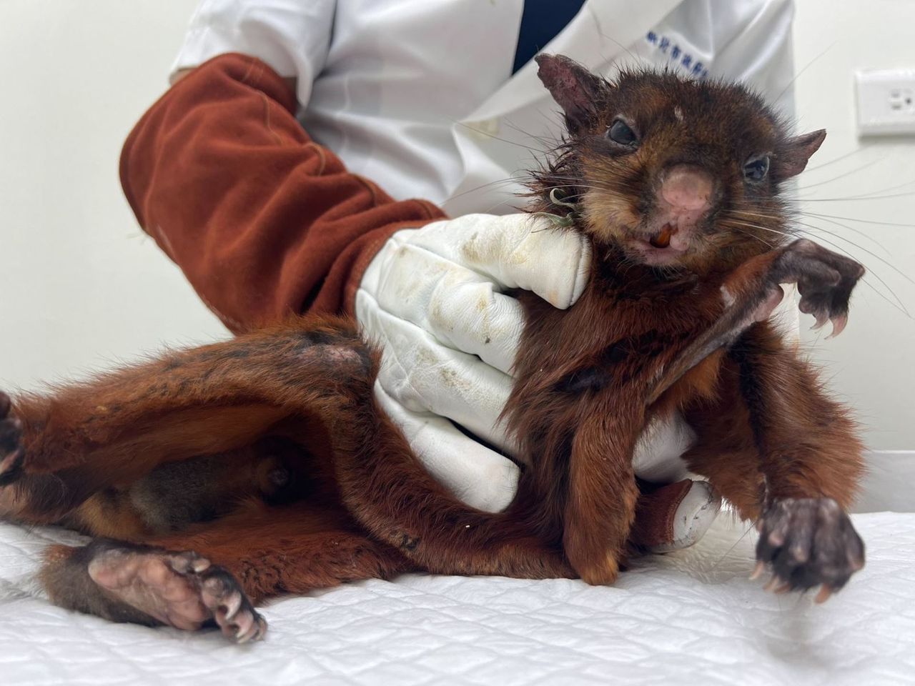 新北市動保處昨(27日)指出,日前接獲民眾通報,在三芝青山路旁的排水溝裡,發現一隻赤褐色、酷似松鼠的小動物。動保員抵達後,確認牠其實是台灣特有的「大赤鼯鼠」,但狀態相當虛弱,幾乎無法自行移動。