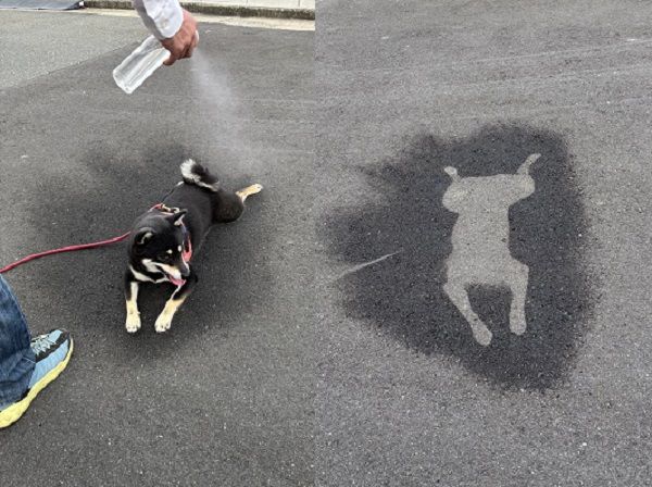 夏季天氣炎熱,寵物散步時也需要做好消暑措施。日本一隻叫做「小拓」的黑柴出門運動時,飼主趁著牠休息特地替愛犬噴灑水霧,試著讓牠感到涼快一些,雖然不確定效果到底好不好,但卻意外在路上留下了一個完美的犬型拓印。