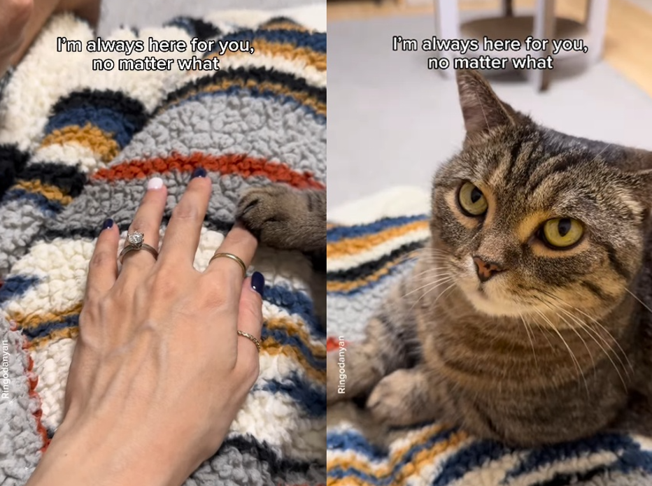 國外一名女子分享,她向老公伸出手尋求專注,然而老公卻一心沉迷在遊戲中、不願意理她,沒想到所養的寵物貓林哥(Ringo)見狀,居然向她伸出手手,似乎在安慰主人「沒關係,有我在」,超貼心畫面在網路爆紅。