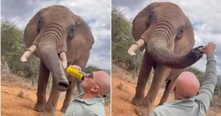 ▲近日,男子在喝啤酒時,竟將啤酒倒入一頭親近人的大象鼻子裡。(圖/翻攝IG/skydive_kenya)