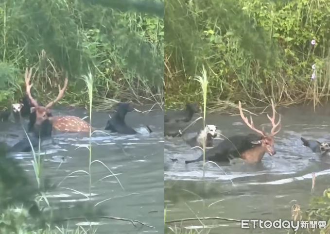 ▲遊蕩犬隻在水中蜂擁而上,攻擊公鹿的背和耳朵。(圖/高雄市馬頭山自然人文協會提供)