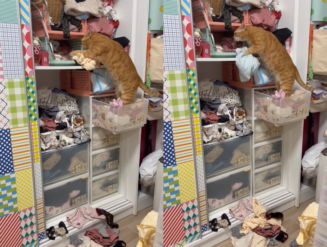 Threads帳號@canele___s分享影片,只見屁橘站在開了一半的塑膠櫃抽屜裡,踩著裡面的衣服,前腳不斷撈上層格子的衣服,越挖越深一件件丟在地上,似乎為媽媽亂亂的衣櫃操碎了心。 媽媽表示,其實平時屁橘不太會直接接觸到衣櫃,那天正好在摺衣服要放回衣櫃,才讓屁橘逮到機會,這也是第一次看到屁橘有這樣的行為。