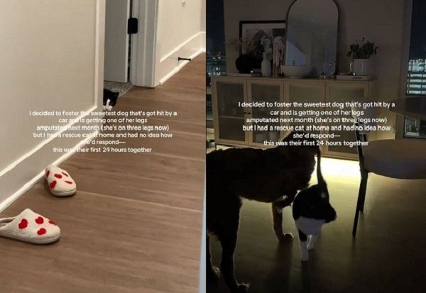 美國田納西州一位叫做費絲(faith)的女網友,中途了一隻因為車禍失去右爪的流浪狗,但也擔心家裡的賓士貓是否能跟狗和平相處。剛開始主子的確非常警戒,但當晚就主動去跟受傷的狗狗摩蹭打招呼,兩隻動物也迅速地成為了好朋友。