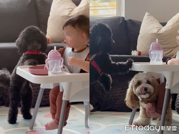 媽媽和《ETtoday寵物雲》分享,其實影片中的狗狗是朋友的,分別是黑貴賓Phoebe和白咖色可卡貴賓Fridy。自己家中也有2隻毛孩,13歲的瑪爾濟斯混西施Sammy和1歲的博美Daisy,牠們都和寶寶Liam非常要好。年紀小的3隻都很聰明、精力旺盛,很黏人又超愛吃。其中Daisy最貪吃,也和寶寶最合得來,就像是小夥伴一樣天天膩在一起。長輩Sammy就穩重很多,偶爾才會湊熱鬧。