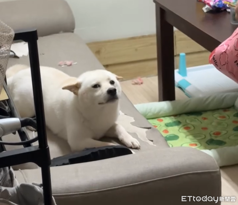 飼主回家看到沙發被拆爆,都還沒有開罵,白柴「飯飯」就壓低耳朵開飛機,擺出一臉超無辜的表情,彷彿在說「是沙發先動手的」,讓主人想罵也罵不出來。