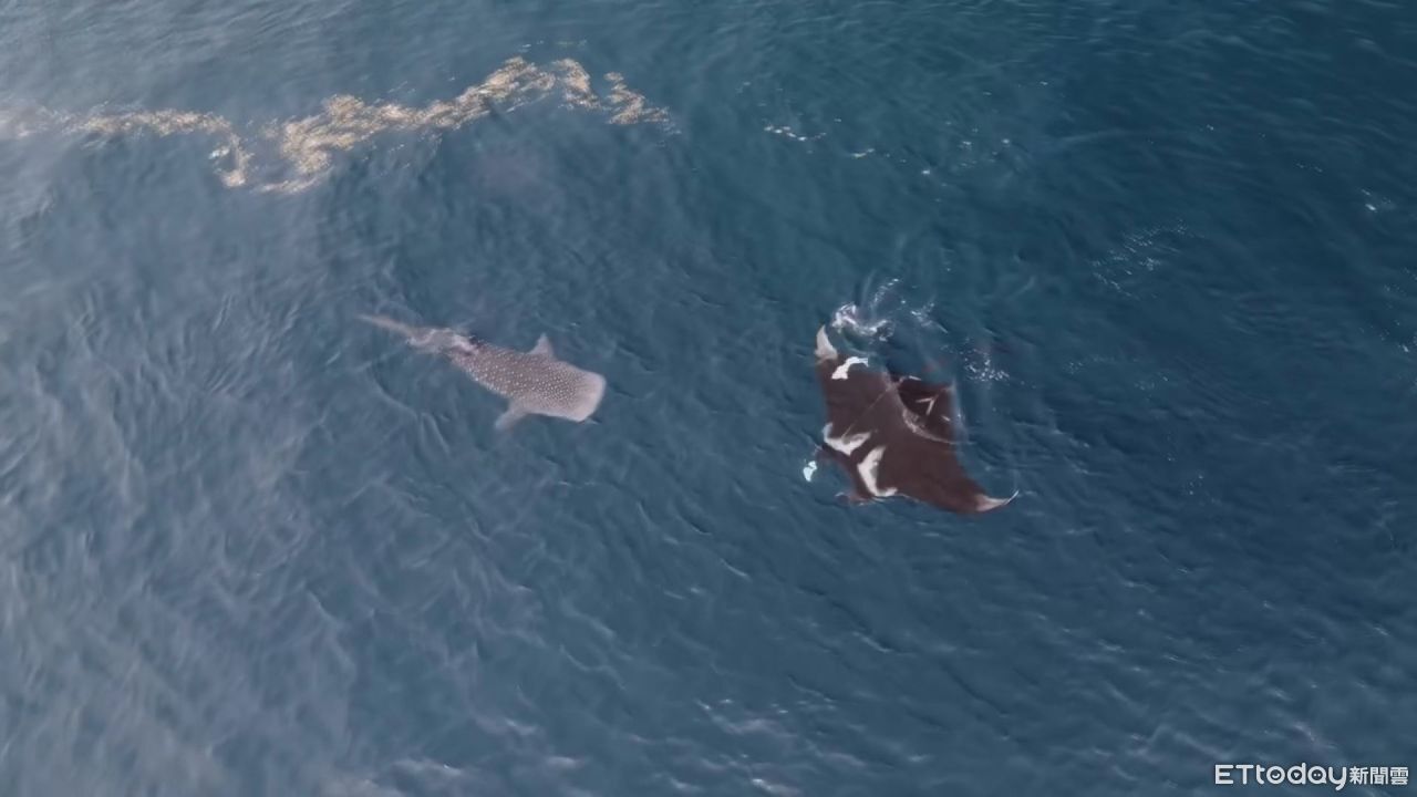 ▲ 澎湖海洋保育志工團隊昨日前往海調時,拍到鯨鯊與鬼蝠魟同框的罕見畫面 。(圖/享飛影像工作室提供)