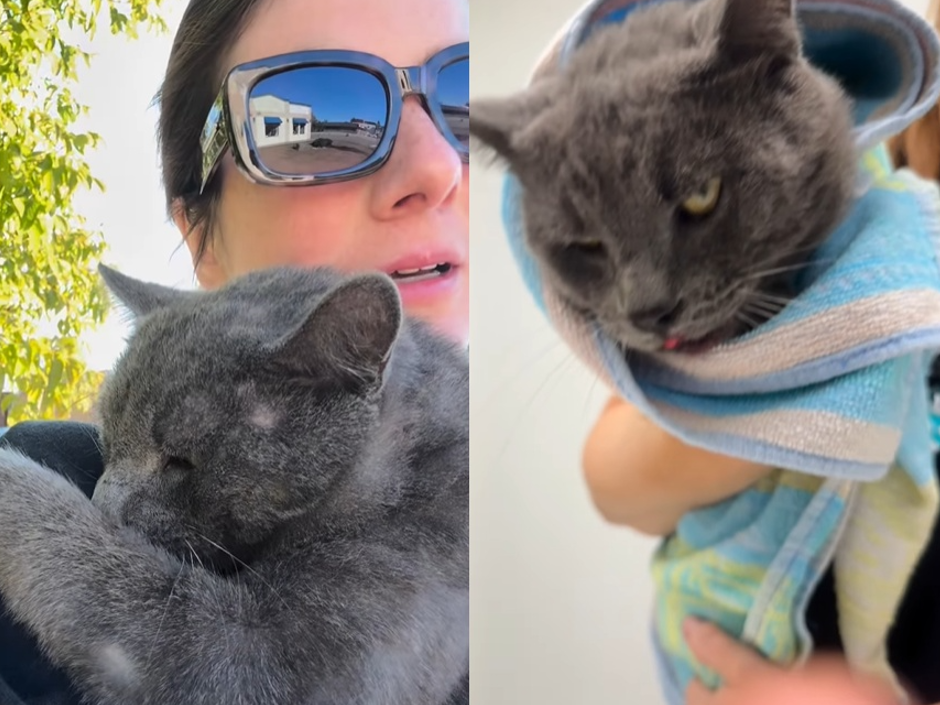 加拿大一名女子與家人度假時,在馬路上看到一隻被車撞的灰貓,她當下顧不得馬路上有大量車潮,立即衝到馬路中央把被撞灰貓帶回安全地帶,受傷貓似乎知道自己安全了,緊緊抱著她表達感謝。