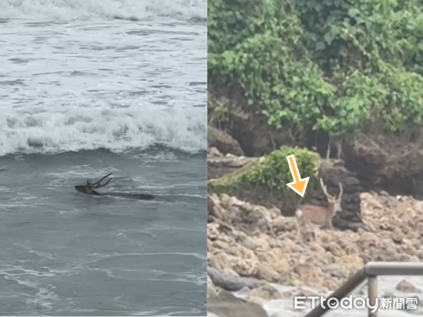 ▲▼颱風後梅花鹿挑戰巨浪,游泳險被滅頂。(圖/網友@daiii1011提供,請勿隨意翻拍,以免侵權。)