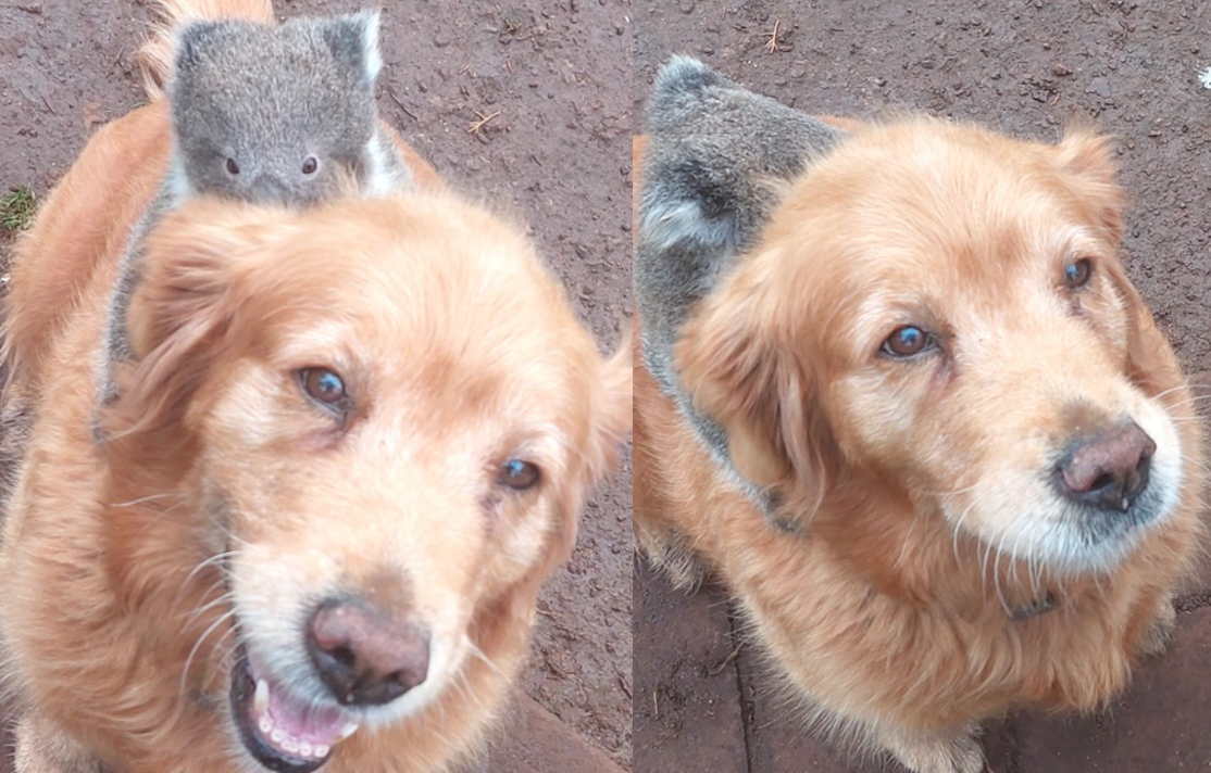 澳洲一名男子聽到前院傳來騷動,好奇出來查看,目睹一隻無尾熊寶寶竟然趴在黃金獵犬身上,緊緊抱住狗狗,罕見畫面把他嚇了一大跳,分享在網路上。
