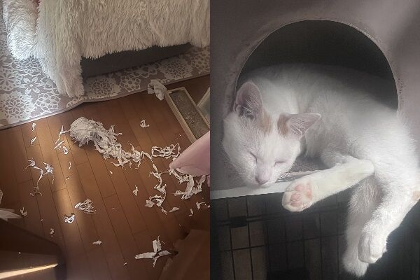 原本好好的捲筒衛生紙線被撕成了碎片,白色的碎紙屑灑的到處都是。兇手顯然就是躺在貓窩裡睡覺,看起來一臉天真無辜的白夜,這隻喵星人顯然花了整個晚上把衛生紙全撕成碎屑,天亮後實在太累忍不住補眠。面對貓咪搞出的破壞,鏟屎官本人倒是很樂觀,「犯人累到熟睡,實在太好笑了」。