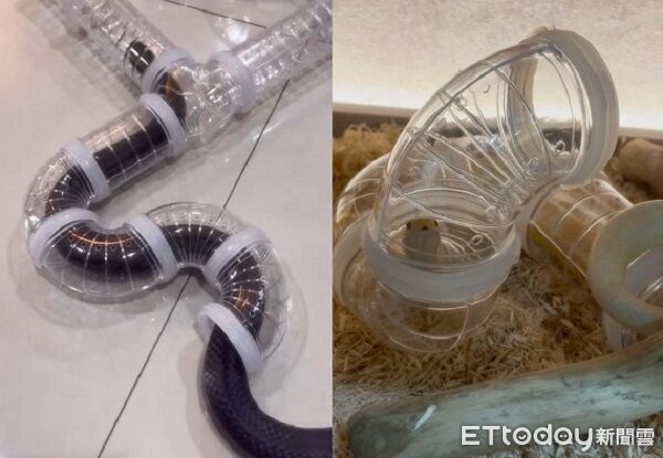 蛇蛇們在屬於自己的管道中探險,讓身體形狀完美嵌合管道的每個彎曲。飼主與《ETtoday寵物雲》分享,自己平時都在蛇寶的房間放躲避屋、樹枝與草屑等傢俱,「都是一些可以讓牠們躲藏跟鑽,還有攀爬的東西」,也會讓三隻在家裡放風探索,由於電火布比較大隻,所以只讓牠在外面玩管道,「還是要注意管徑,不然卡住的話蛇蛇可能會受傷」。