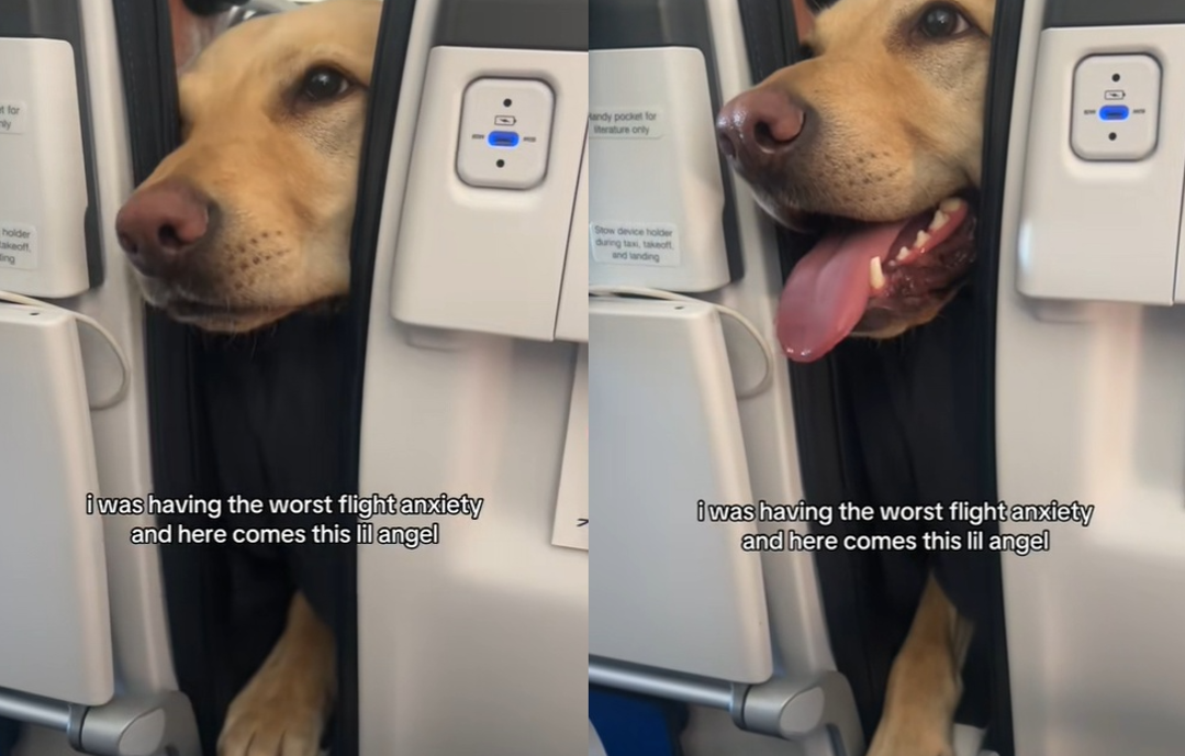 女子蘇菲(Sophie)在網路上分享,當時她在飛機上經歷嚴重的飛行焦慮,突然感受到來自前座乘客的關心,一隻可愛的服務犬,「我當時飛行焦慮非常嚴重,這個小天使就出現了」。