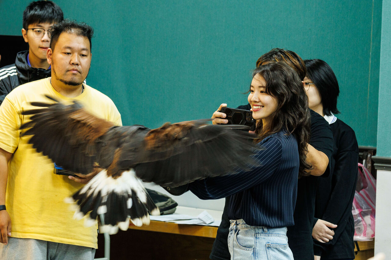 講座邀請「中華民國馴鷹協會」會長陳建宏,以及「蘭陽綠野環境教育及保護協會」常務理事江瑋銘,介紹目前國內開放飼養的猛禽物種,如哈里斯鷹與遊隼,以及南美蜥、球蟒、玉米蛇等兩棲爬蟲類。除了分享特殊寵物的飼養知識,也強調這不僅是個人興趣,更與生態平衡及永續發展息息相關。