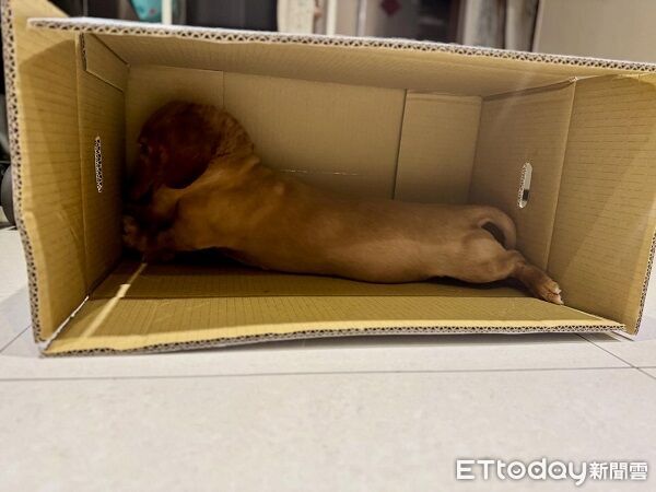 臘腸狗「弟弟」今年13歲,是飼主全家的開心果。這天爸爸正在開箱買給牠的新零食,隨口一句請弟弟去量紙箱有多大,結果貼心的牠立刻化身比例尺,親身上陣鑽進去伸展四肢,一動不動彷彿在認真計算長度