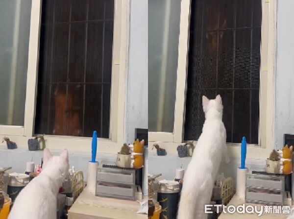 ▲多比發現鼯鼠出現,站在窗台邊緊盯。(圖/Threads@921amy__提供,請勿隨意翻拍,以免侵權)