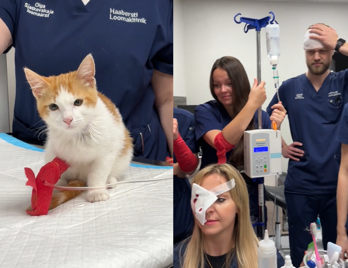 位於愛沙尼亞的動物醫院HAABERSTI LOOMAKLIINIK主打「貓咪友善」,因此獸醫們會營造讓貓咪較緩和的環境,對貓咪也特別有一套,不過這次來了一隻橘白色小貓,卻讓他們敗下陣來。小橘貓在診療台上右手已纏繞紅色繃帶,然而在牠身後的7名獸醫也各個掛彩,有的手臂纏著繃帶、有的冰敷眼睛,有的手上還正在流血,這隻看似小小的貓咪戰鬥力驚人。