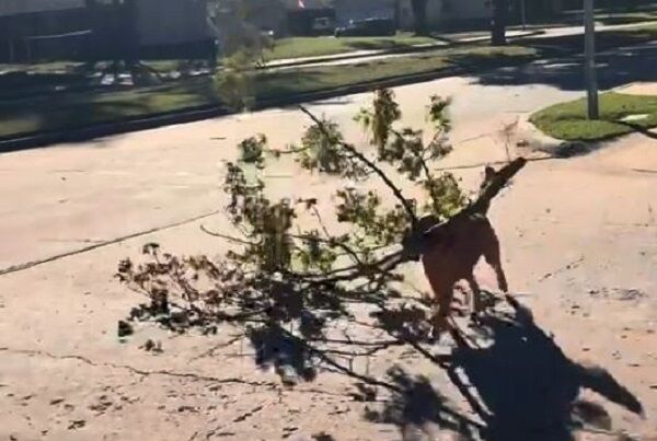 Shipley嘴裡咬著最粗的主幹,看見主人後尾巴開心的翹起來,完全不在意它有沒有辦法塞進家門。這棵「戰利品」的枝幹、樹葉全部保留完整,就連上面的葉子都仍然翠綠,總體長度甚至比牠的身體還長。然而這並非第一次看到Shipley帶著「超規格樹枝」回家,只要牠在外面總能在別人的庭院、剛被修剪不久的行道樹下挖到寶。